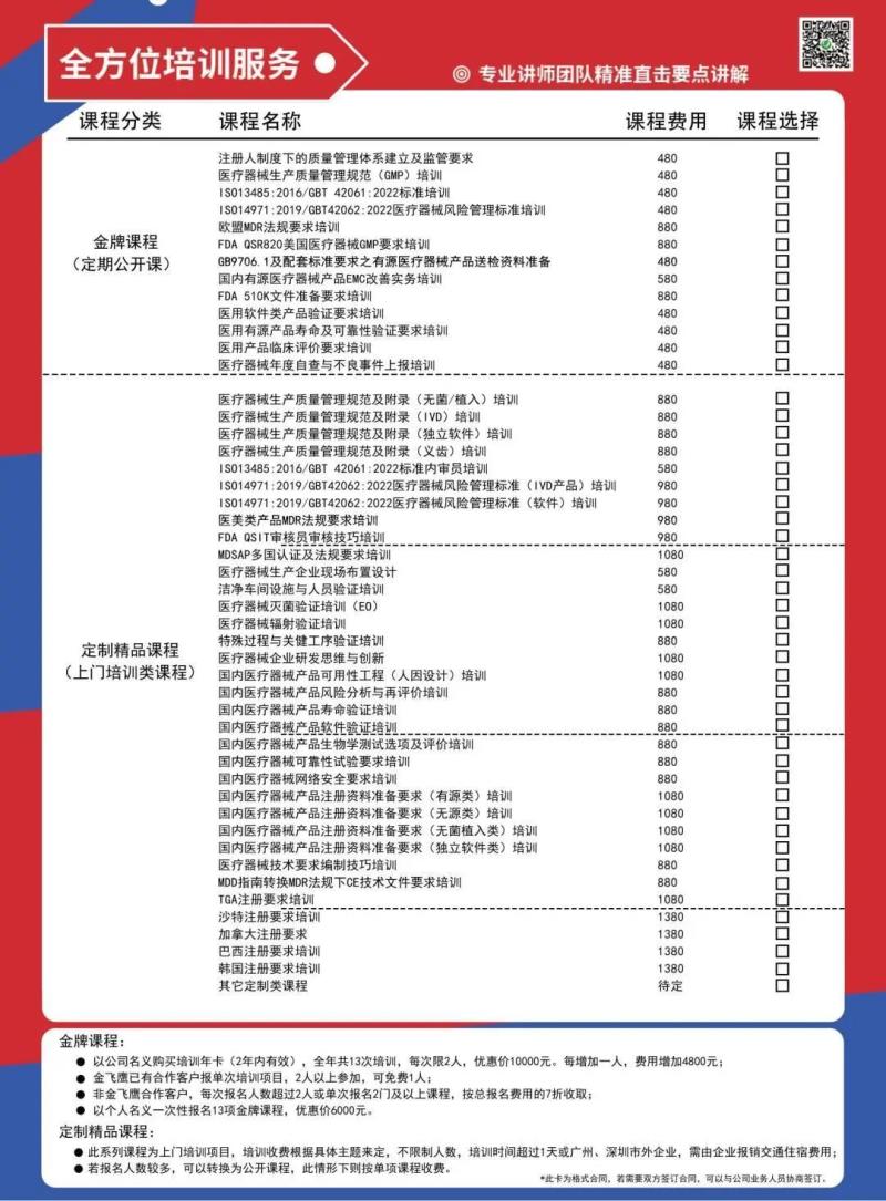 培訓(xùn)分為定期線下公開課及上門培訓(xùn)兩種形式,共有13節(jié)金牌課程+34節(jié)定制精品課程(詳見下方海報(bào)),課程主題涵蓋了醫(yī)療器械國(guó)內(nèi)外注冊(cè)及體系的多個(gè)環(huán)節(jié)、多個(gè)領(lǐng)域,優(yōu)選金飛鷹具備豐富專業(yè)知識(shí)及實(shí)戰(zhàn)經(jīng)驗(yàn)的技術(shù)及項(xiàng)目老師,為學(xué)員提供全方位、高質(zhì)量的醫(yī)療器械注冊(cè)指導(dǎo)。感興趣的可掃描下方二維碼報(bào)名哦~