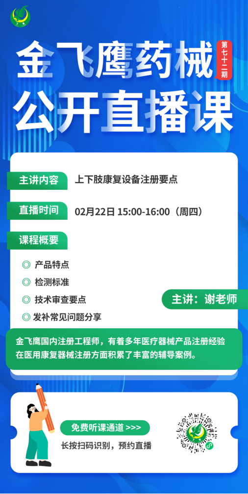 2月22日下午3點(diǎn),金飛鷹國內(nèi)注冊工程師,有著多年醫(yī)療器械產(chǎn)品注冊經(jīng)驗(yàn),在醫(yī)用康復(fù)器械注冊方面積累了豐富輔導(dǎo)案例的謝老師,給大家?guī)怼渡舷轮祻?fù)設(shè)備注冊要點(diǎn)》,培訓(xùn)內(nèi)容包括產(chǎn)品特點(diǎn)、檢測標(biāo)準(zhǔn)、技術(shù)審查要點(diǎn)、發(fā)補(bǔ)常見問題等,相關(guān)企業(yè)千萬不要錯(cuò)過了哦!