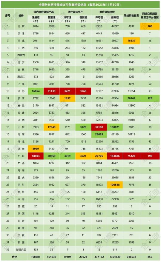 12月11日,國家藥監(jiān)局公布了截至2023年11月30日各省有效期內(nèi)醫(yī)療器械產(chǎn)品注冊備案、醫(yī)療器械生產(chǎn)企業(yè)許可備案等信息,老規(guī)矩,金飛鷹小編對此稍作編輯,標(biāo)注紅色、綠色、黃色的分別為前三甲。