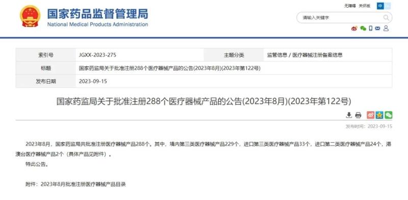 據(jù)國家藥監(jiān)局官網(wǎng)近日發(fā)布,2023年8月,國家藥監(jiān)局共批準(zhǔn)注冊醫(yī)療器械產(chǎn)品288個(gè)。其中,境內(nèi)第三類醫(yī)療器械產(chǎn)品229個(gè),進(jìn)口第三類醫(yī)療器械產(chǎn)品33個(gè),進(jìn)口第二類醫(yī)療器械產(chǎn)品24個(gè),港澳臺(tái)醫(yī)療器械產(chǎn)品2個(gè)。
