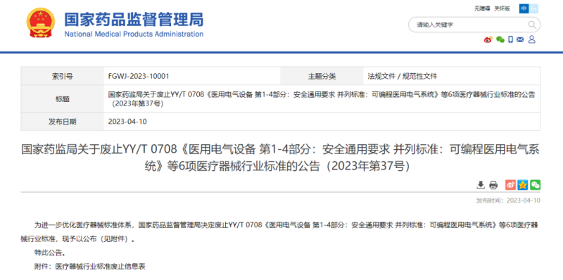 4月10日,國家藥監(jiān)局官網(wǎng)發(fā)布公告稱,廢止YY/T 0708-2009《醫(yī)用電氣設(shè)備 第1-4部分:安全通用要求 并列標(biāo)準(zhǔn):可編程醫(yī)用電氣系統(tǒng)》、YY/T 0287-2017《醫(yī)療器械 質(zhì)量管理體系 用于法規(guī)的要求》等6項(xiàng)行業(yè)標(biāo)準(zhǔn),在國家藥監(jiān)局發(fā)布的原有附件基礎(chǔ)上,我們加上了這幾項(xiàng)標(biāo)準(zhǔn)的新版替代標(biāo)準(zhǔn),具體如下:
