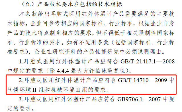 再比如,《耳腔式醫(yī)用紅外體溫計注冊技術(shù)審查指導(dǎo)原則》也指出,耳腔式醫(yī)用紅外體溫計產(chǎn)品應(yīng)符合GB/T 14710-2009中氣候環(huán)境II組和機械環(huán)境II組的要求。