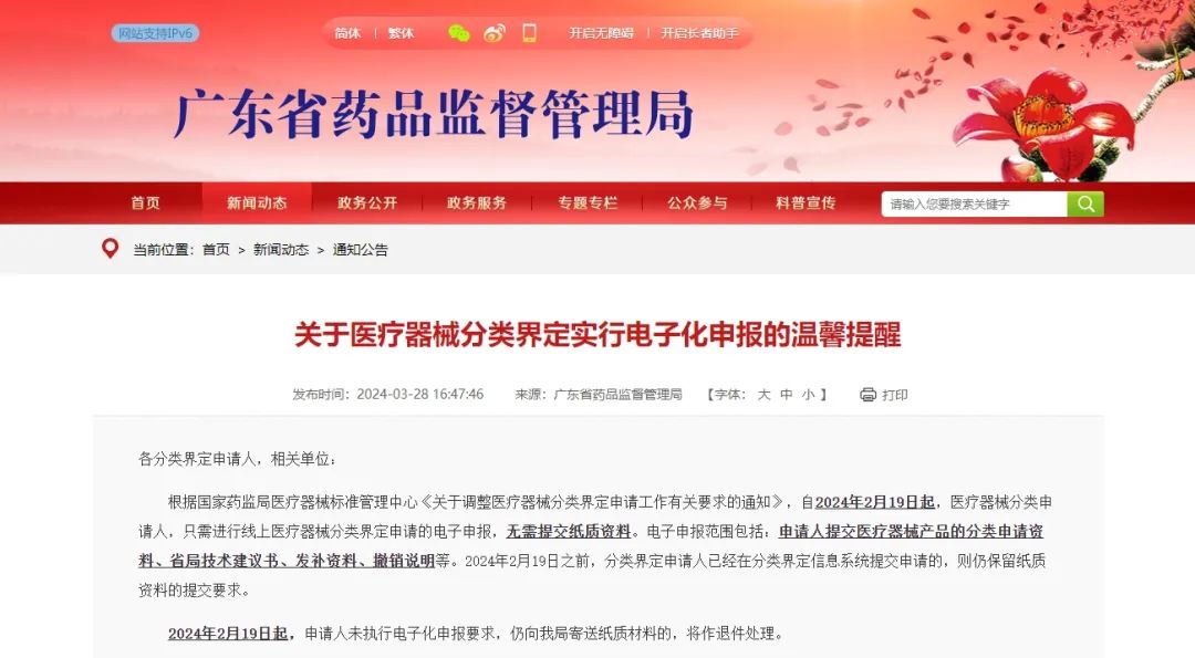 3月28日,廣東省藥監(jiān)局發(fā)布《關(guān)于醫(yī)療器械分類界定實行電子化申報的溫馨提醒》,其中提到,自2024年2月19日起,醫(yī)療器械分類申請人,只需進(jìn)行線上醫(yī)療器械分類界定申請的電子申報,無需提交紙質(zhì)資料。電子申報范圍包括:申請人提交醫(yī)療器械產(chǎn)品的分類申請資料、省局技術(shù)建議書、發(fā)補(bǔ)資料、撤銷說明等。2024年2月19日之前,分類界定申請人已經(jīng)在分類界定信息系統(tǒng)提交申請的,則仍保留紙質(zhì)資料的提交要求。