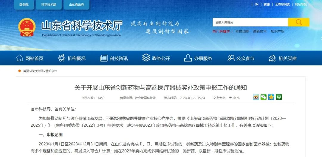 近日,山東省科學技術廳發(fā)布通知稱,根據(jù)《山東省創(chuàng)新藥物與高端醫(yī)療器械引領行動計劃(2023-2025年)》(魯科創(chuàng)委辦發(fā)〔2022〕3號)相關要求,決定開展2023年度創(chuàng)新藥物與高端醫(yī)療器械獎補政策申報工作,有關事項具體如下: