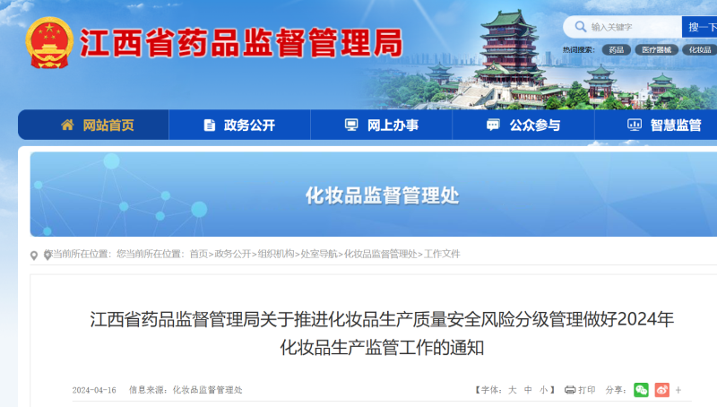 近日江西省藥監(jiān)局發(fā)布關(guān)于推進(jìn)化妝品生產(chǎn)質(zhì)量安全風(fēng)險(xiǎn)分級(jí)管理做好2024年化妝品生產(chǎn)監(jiān)督工作的通知,主要內(nèi)容如下: