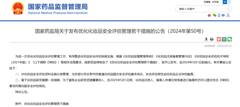 近日,國家藥監(jiān)局制定了《優(yōu)化化妝品安全評估管理若干措施》用于優(yōu)化化妝品安全評估管理,自2024年5月1日起施行。允許部分符合條件的普通化妝品提交安全評估基本結論,安全評估報告由化妝品企業(yè)存檔備查。