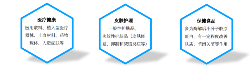 膠原蛋白因?yàn)樵诠I(yè)上有廣泛的應(yīng)用,被認(rèn)為是用途最廣泛的生物材料之一。由于其高蛋白質(zhì)含量以及諸如吸水性、凝膠形成性和乳化穩(wěn)定性的功能性屬性,在食品工業(yè)中對(duì)膠原蛋白有著巨大的需求。在生物醫(yī)學(xué)和制藥領(lǐng)域,膠原蛋白有著多種應(yīng)用,被用作藥物、蛋白質(zhì)和基因的載體,同時(shí)也可作為人造人類皮膚、血管和韌帶的替代品。