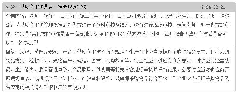 根據(jù)國家藥監(jiān)局食品藥品審核查驗中心的答復(fù),《醫(yī)療器械生產(chǎn)企業(yè)供應(yīng)商審核指南》規(guī)定“生產(chǎn)企業(yè)應(yīng)當(dāng)根據(jù)對采購物品的要求,包括采購物品類別、驗收準(zhǔn)則、規(guī)格型號、規(guī)程、圖樣、采購數(shù)量等,制定相應(yīng)的供應(yīng)商準(zhǔn)入要求,對供應(yīng)商經(jīng)營狀況、生產(chǎn)能力、質(zhì)量管理體系、產(chǎn)品質(zhì)量、供貨期等相關(guān)內(nèi)容進行審核并保持記錄。必要時應(yīng)當(dāng)對供應(yīng)商開展現(xiàn)場審核,或進行產(chǎn)品小試樣的生產(chǎn)驗證和評價,以確保采購物品符合要求?!逼髽I(yè)應(yīng)當(dāng)根據(jù)采購物品及供應(yīng)商的相關(guān)情況采取相應(yīng)的審核方式。