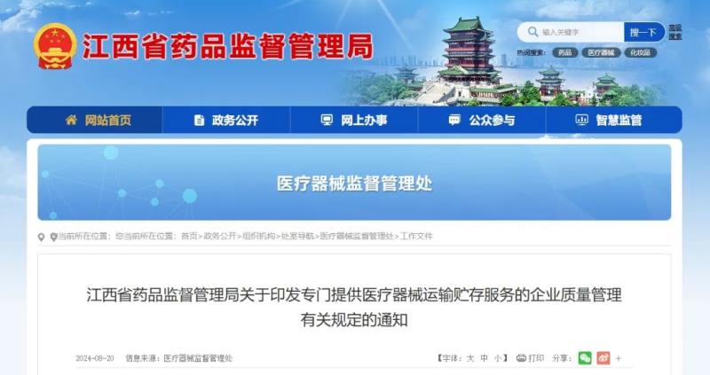 8月20日,江西省藥監(jiān)局發(fā)布《專門(mén)提供醫(yī)療器械運(yùn)輸貯存服務(wù)的企業(yè)質(zhì)量管理有關(guān)規(guī)定》(以下簡(jiǎn)稱《規(guī)定》),并宣布自2025年1月1日起施行。