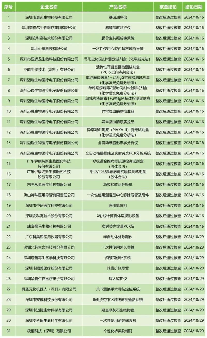 11月11日,廣東省藥監(jiān)局官網(wǎng)公布2024年10月醫(yī)療器械注冊質(zhì)量管理體系核查結(jié)果,包括深圳市真邁生物科技有限公司的基因測序儀、深圳市中研醫(yī)療科技有限公司的醫(yī)用氫氧機、廣東科美思醫(yī)用儀器有限公司的半自動體外除顫儀等共計31款產(chǎn)品,核查結(jié)論均為“整改后通過核查”。具體明細見下方表格: