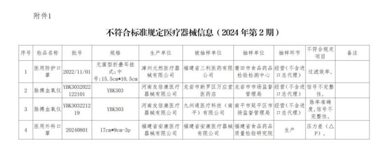 12月16日,福建省藥監(jiān)局發(fā)布《福建省醫(yī)療器械監(jiān)督抽檢結(jié)果通告(2024年第2期)》,共通告了醫(yī)用防護(hù)口罩、脈搏血氧儀等4批次不符合標(biāo)準(zhǔn)規(guī)定的醫(yī)療器械產(chǎn)品,不符合規(guī)定項(xiàng)目有過濾效率、信號(hào)不完整性等,具體明細(xì)如下: