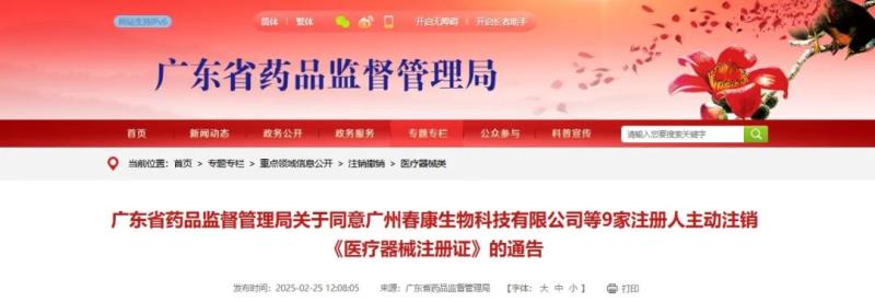 2月25日,廣東藥監(jiān)局發(fā)布通告稱,廣州春康生物科技有限公司、廣東佳駿科技有限公司等9家注冊(cè)人向廣東省藥品監(jiān)督管理局主動(dòng)提出注銷產(chǎn)品注冊(cè)證的申請(qǐng)。根據(jù)《醫(yī)療器械監(jiān)督管理?xiàng)l例》的規(guī)定,現(xiàn)對(duì)該9家注冊(cè)人持有的10張《醫(yī)療器械注冊(cè)證》依法予以注銷,主要包括醫(yī)用口罩、紅外體溫計(jì)、壓縮式霧化器等產(chǎn)品,具體明細(xì)如下:
