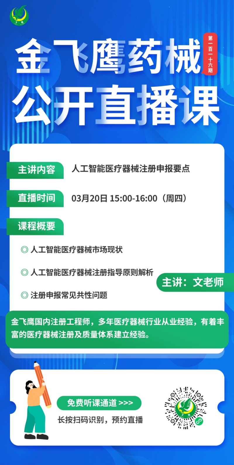 金飛鷹直播培訓(xùn)簡介 金飛鷹直播培訓(xùn),是每周一次的固定培訓(xùn)欄目,優(yōu)選金飛鷹國內(nèi)外資深注冊/項(xiàng)目老師定期為大家講解醫(yī)療器械注冊相關(guān)知識(shí),解答大家在醫(yī)療器械注冊過程中的諸多疑問。 此前我們已為大家?guī)硇掳驷t(yī)療器械生物學(xué)評(píng)價(jià)標(biāo)準(zhǔn)、新版醫(yī)療器械風(fēng)險(xiǎn)管理標(biāo)準(zhǔn)、醫(yī)療器械軟件注冊、醫(yī)療器械質(zhì)量管理體系提升技巧等共計(jì)115次線上培訓(xùn)課程,有興趣的可點(diǎn)擊視頻號(hào)直播回放進(jìn)行查看~另外大家也一定很關(guān)注接下來的培訓(xùn)主題,相關(guān)培訓(xùn)預(yù)告我們會(huì)陸續(xù)添加至視頻號(hào),請大家持續(xù)關(guān)注哦!