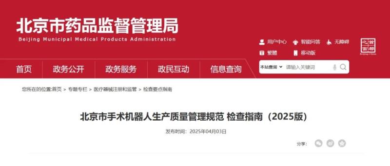 近日,北京市藥監(jiān)局發(fā)布《北京市手術機器人生產(chǎn)質(zhì)量管理規(guī)范檢查指南(2025版)》(以下簡稱《指南》),旨在幫助北京市醫(yī)療器械生產(chǎn)監(jiān)管人員增強對手術機器人產(chǎn)品及相關生產(chǎn)質(zhì)量管理的認知,指導和規(guī)范對手術機器人注冊人、受托生產(chǎn)企業(yè)(以下統(tǒng)稱“生產(chǎn)企業(yè)”)的監(jiān)督檢查工作,同時為相關生產(chǎn)企業(yè)開展生產(chǎn)管理活動提供參考。