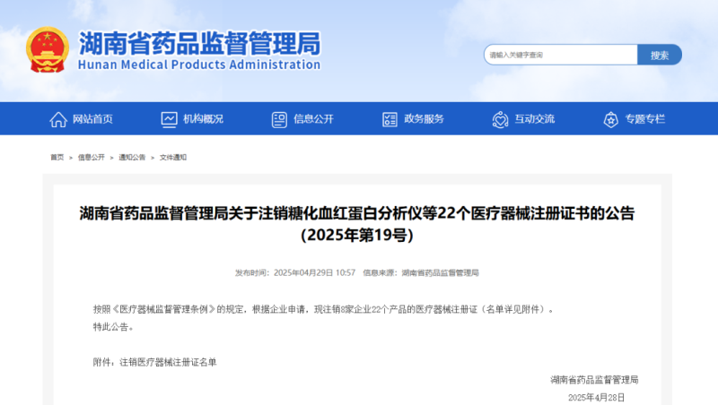4月29日,湖南省藥監(jiān)局發(fā)布公告稱,按照《醫(yī)療器械監(jiān)督管理條例》的規(guī)定,根據(jù)企業(yè)申請,現(xiàn)注銷湖南普門醫(yī)療科技有限公司、湖南雷杜生物技術有限公司等8家企業(yè)的22個產(chǎn)品的醫(yī)療器械注冊證,具體明細如下: